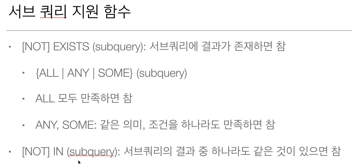 - 기존 쿼리문에서 추가적으로 조건을 만들거나 할 때 서브 쿼리를 만들어 사용할 수 있음. 메인 쿼리와 서브 쿼리는 전혀 관계가 없다. (쿼리 안에 쿼리를 넣는 식)