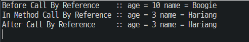 System.out.println("After Call By Reference :: age = "+dog.age+" name = "+dog.name+"");