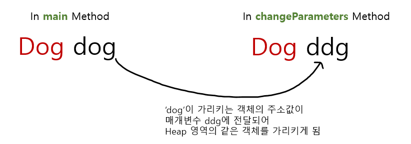 하지만 클래스 객체와 같은 참조 자료형을 매개 변수로 전달할때는 '주소값'이 전달되어 다른 언어의 Call By Reference방식 처럼 메소드 내에서 변경한 값이 메소드 호출 이후에도 유지되게끔 할 수 있다.